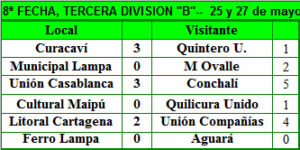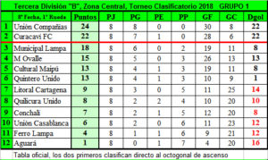 Unión Compañías logró una cómoda victoria de 4 tantos a 2 a Litoral Cartagena consolidándose como líder del torneo en partido válido por la 8ª fecha de la Tercera División “B”, Grupo 1: El partido se jugó este fin de semana y se prepara para recibir a ferro Lampa en el Complejo Los Llano.La tabla se disgrega y son dos los clubes invictos que mantienen una diferencia de 2 puntos y se distancian de los demás clubes, más aún cuando no se esperaba la segunda derrota de de Municipal de Lampa que lo aleja de los lugares de privilegio. Curacaví se mantiene en el segundo lugar luego de ganar jugando se local a Quintero Unido.