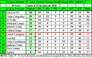 La derrota de Curacaví en su visita al norte chico enfrentado a Municipal Ovalle coloca incertidumbre por el campeón en esta fase del torneo clasificatorio para el Torneo final que definirá los dos clubes que ascenderán directamente y los dos que disputaran la permanencia de otros dos clubes de la tercera División “A”. Por otra parte los tres clubes que suman 30 punt0os, entre ellos Cultural Maipú están prácticamente a 4 puntos de clasificar para el Campeonato Oficial de Ascenso a la Tercera División “A”.Esta prácticamente definido los clubes que participaran en el Campeonato Oficial de Ascenso de Tercera División “B” luego de los restados de la fecha que concluye, quedando un solo club por amagar a los 3 clubes que suman 30 puntos, este club es Litoral Cartagena, pero para que se de esa contingencia debiera perder todos los partidos algunos de estos tres clubes y Litoral ganarlos 5 partidos que restan.