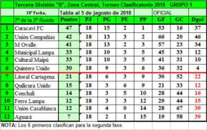 El sexto club que tiene las posibilidades de clasificar para la 2ª Fase es Quintero Unido, club que tiene un difícil partido ante el puntero, Curacaví FC, aunque de local, pero no todo esta perdido ya que debe sumar al menos 4 puntos en los en las 4 fechas que restan para clasificar a la fase de los 6 mejores de este grupo.