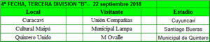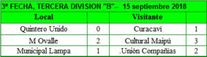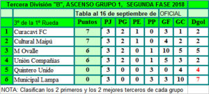 Este sábado 15 de septiembre solo hubo fútbol de Tercera División “B”, triunfando los dos clubes que están al tope de la tabla en el Grupo 1; Cultural Maipú ganó 3 x 2 a Munici0pal Ovalle en el Estadio Diaguitas, mientras que Curacaví, que en este hexagonal ha mostrado que puede ser uno de los 8 que quede para cuartos de final de ascenso, logra ganar por la cuenta mínima a Quintero Unido. Por su parte Cultural Maipú ganó y sigue mostrando que está para más.